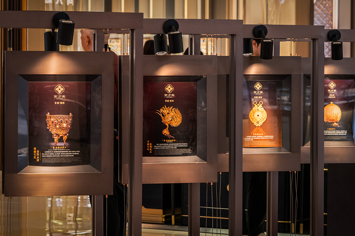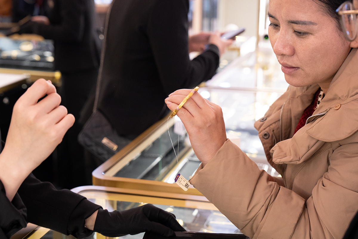 东方棠摒弃单纯艺术展览模式,将快闪店打造为“体验+展示+转化”的复合场景。区别于传统黄金专柜的零售逻辑,这里以“零距离体验”为核心,允许消费者上手触摸、把玩、鉴赏作品,将非遗工艺的质感优势转化为直观消费冲动,精准契合80/90后高知客群的体验式消费需求,实现从“打卡流量”到“消费转化”的升级。